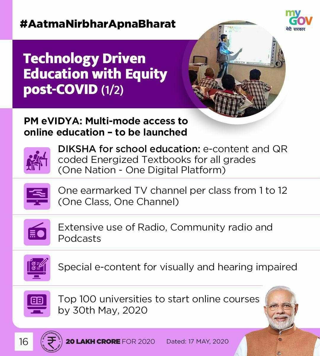◆ पीएम ई-विद्या- डिज़िटल/ ऑनलाइन शिक्षा के लिए मल्टी-मोड एक्सेस के लिए एक कार्यक्रम तुरंत लॉन्च किया जाएगा।