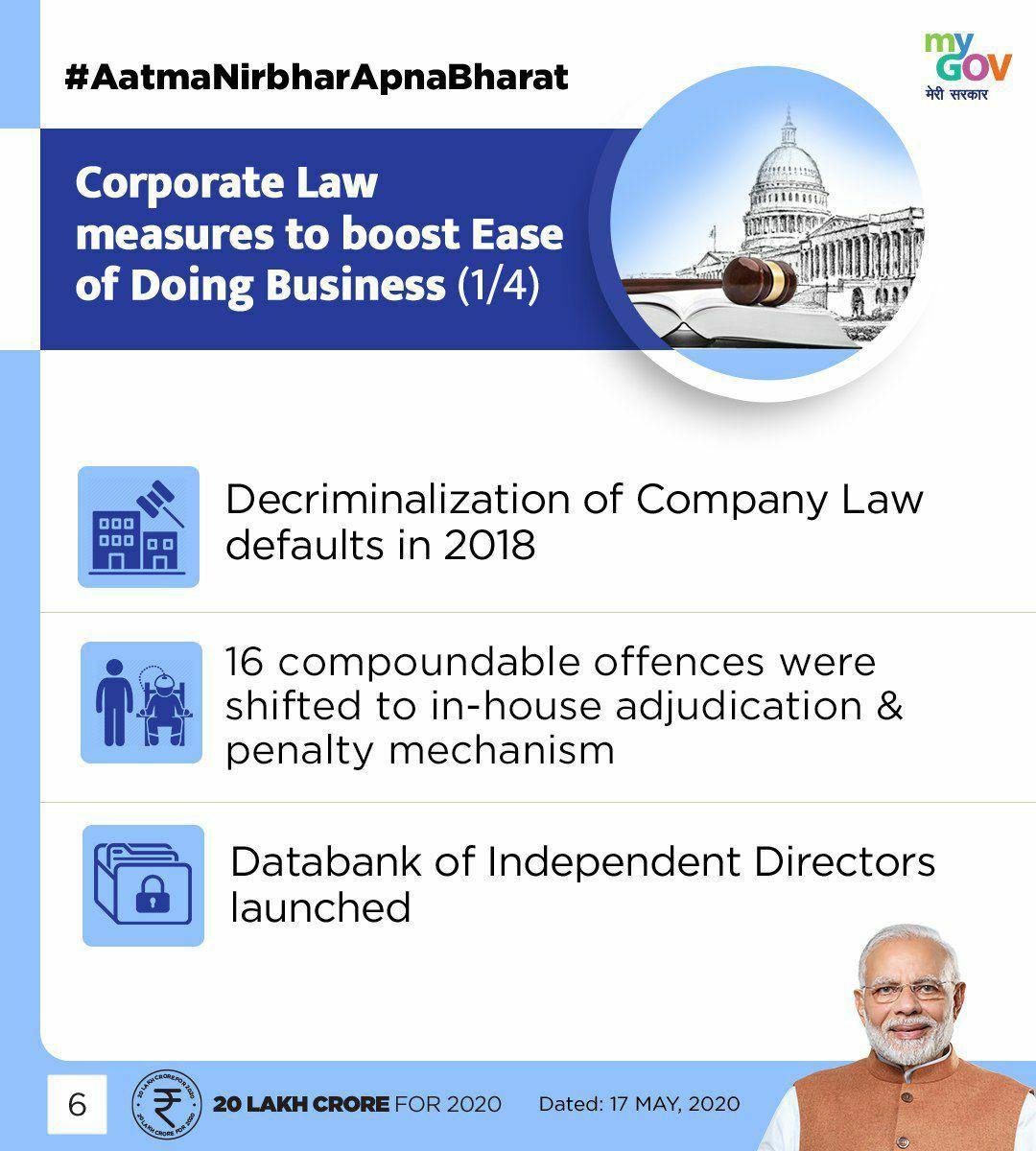 ◆ कंपनियों के डीक्रिमिनलाइज़ेशन ऐक्ट में सुधार मामूली मामलों में और तकनीकी और प्रक्रियात्मक चूकों को अपराधीकरण की सूची से निकाल दिया जाएगा।