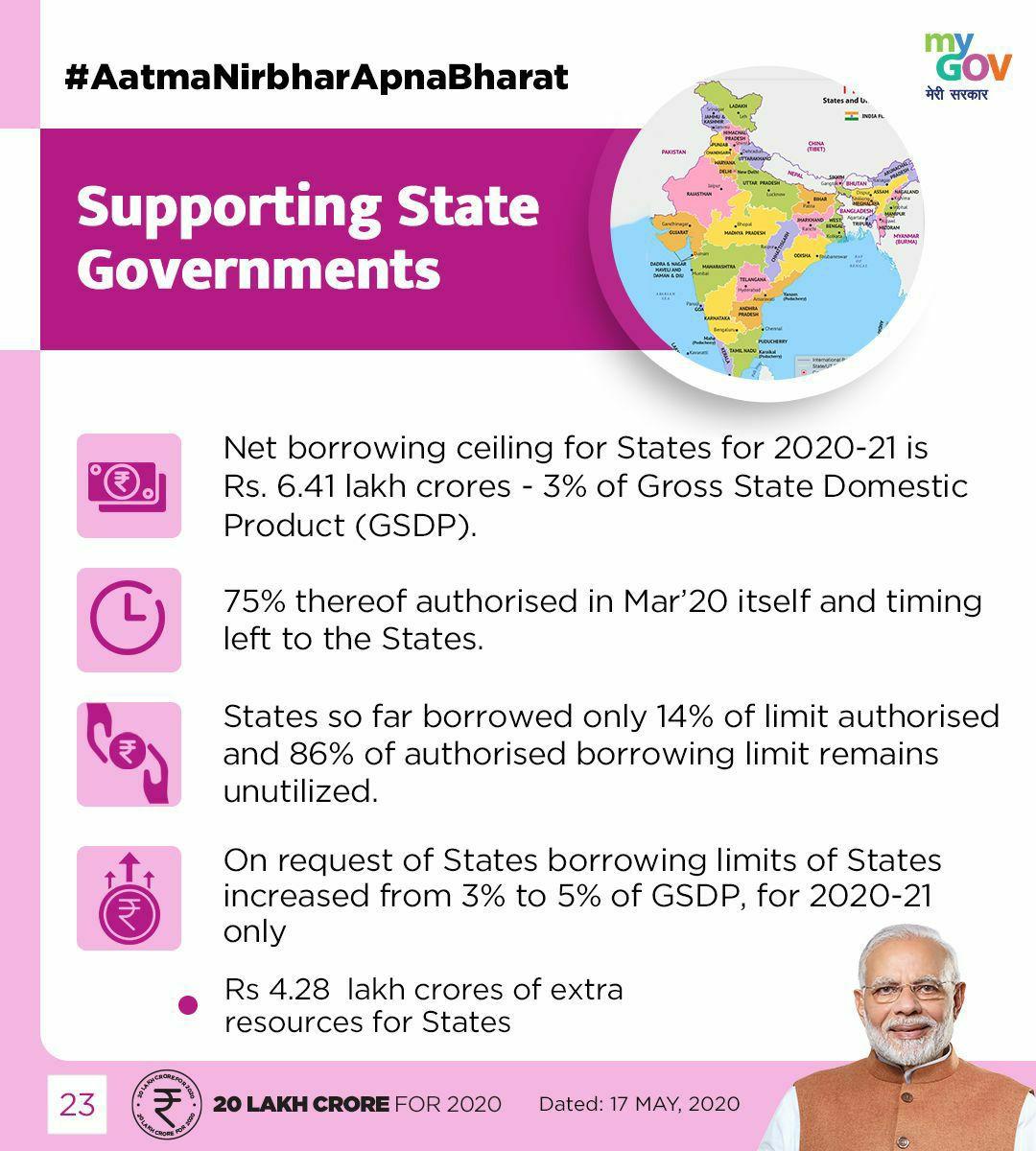 ◆ 2020-21 के लिए राज्य जीएसडीपी (राज्यों के सकल घरेलू उत्पाद) का 3% या 6.41 लाख करोड़ रूपए तक का क़र्ज़ ले सकते हैं। इसे बढ़ाकर 5% किया जा रहा है. राज्यों ने इसकी माँग की थी जिसे मान लिया गया है।