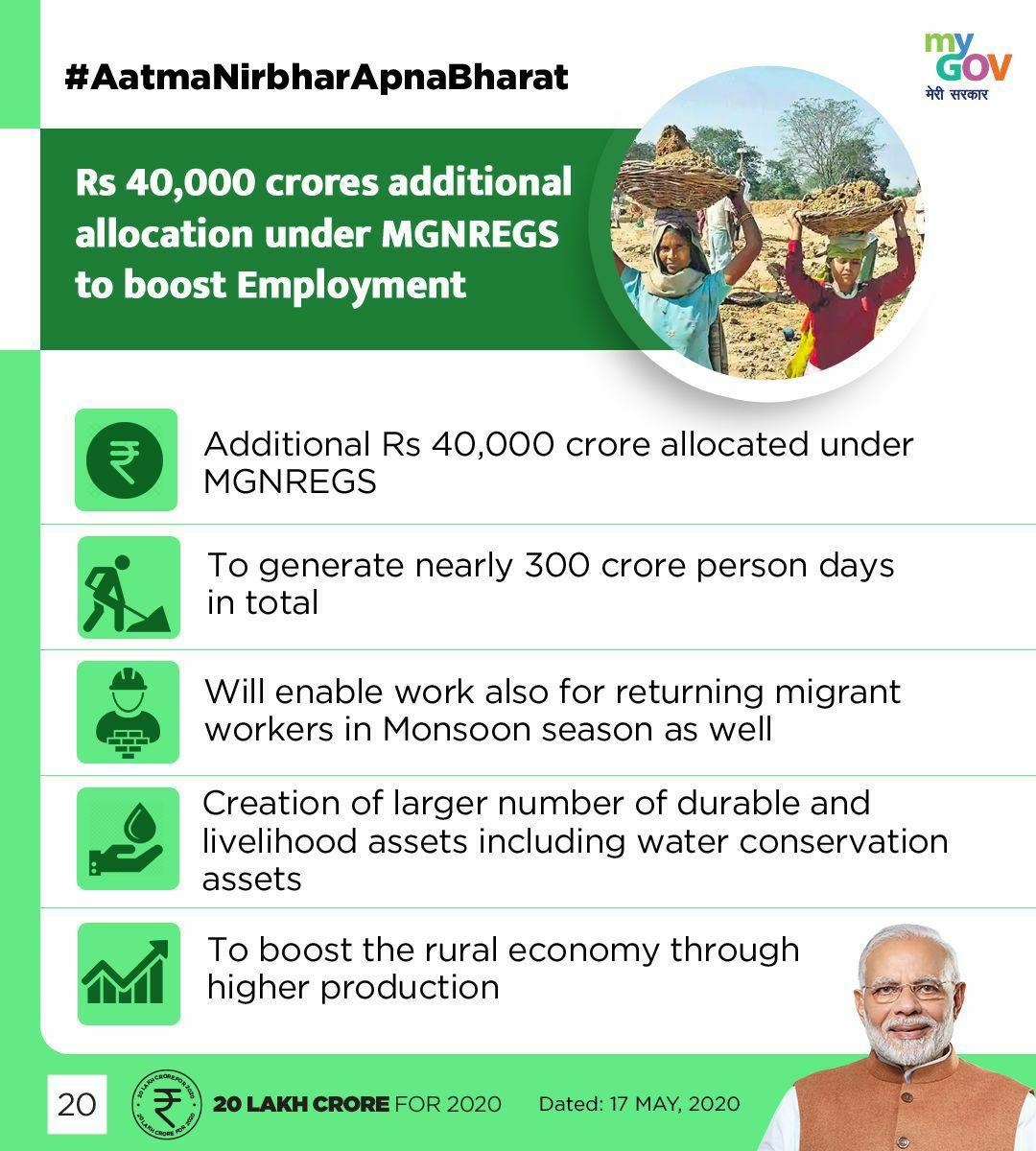 ◆ मनरेगा के लिए सरकार अतिरिक्त 40 हज़ार करोड़ रुपए का आवंटन करेगी।