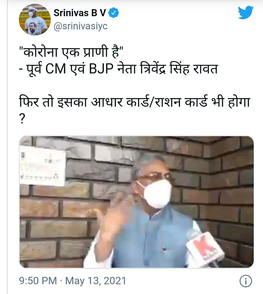 इंडियन यूथ कांग्रेस के अध्यक्ष श्रीनिवास बीवी ने तंज़ कसा है कि *कोरोना एक प्राणी है तो इसका आधार कार्ड-राशन कार्ड भी होगा?