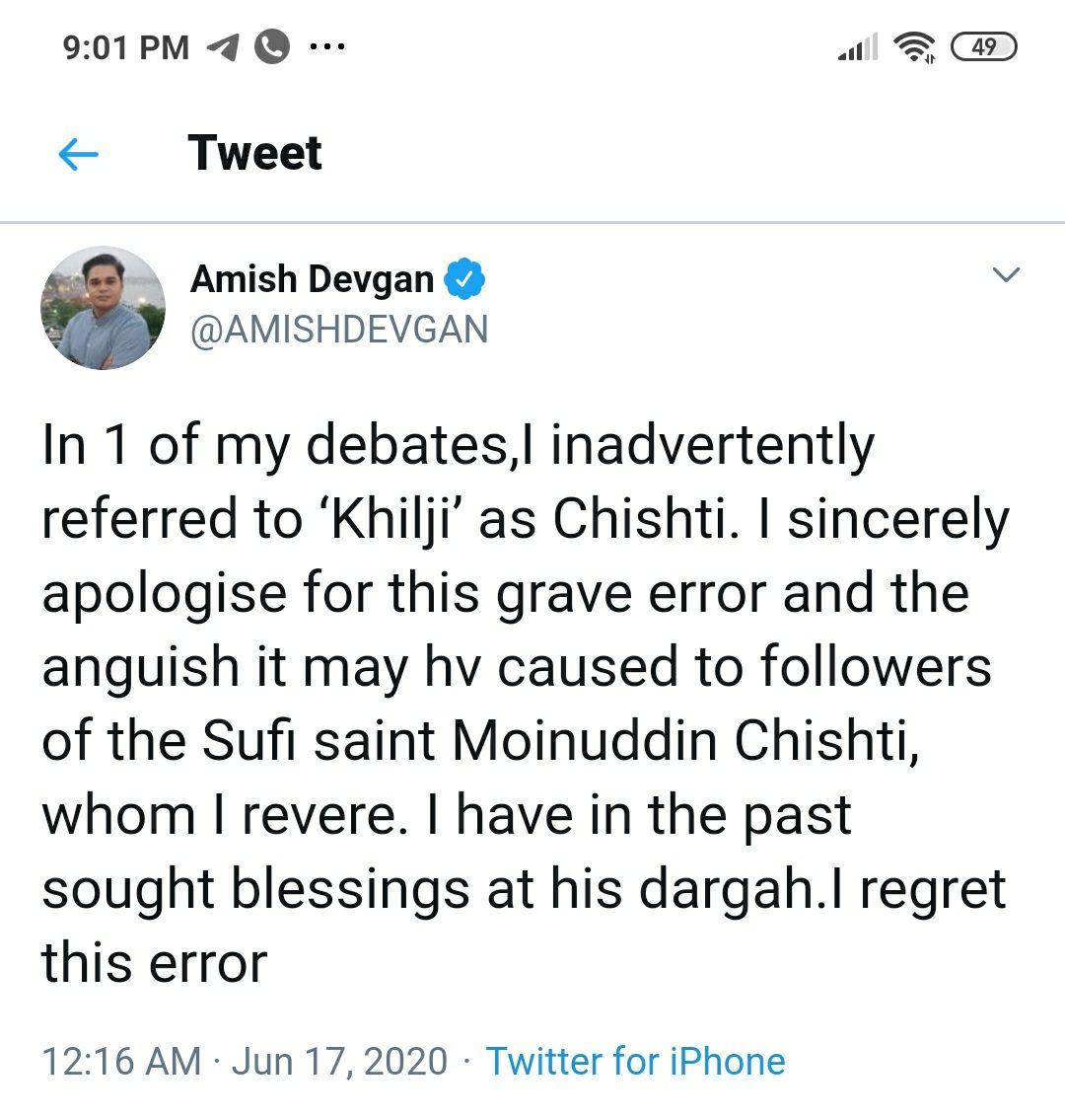 ग़लती पर खेद जताने में हुई ग़लती पर क्या आपकी नज़र पड़ी? देवगन साहब ने अपने ट्वीट में जो लिखा है, उसका मतलब यह है कि अमीश देवगन को इस बात का खेद है कि उसने "ख़िलजी" का उल्लेख "चिश्ती" के रूप में कर दिया। यानी ख़िलजी, चिश्ती जैसा नहीं है। इस बात पर देवगन को खेद है।