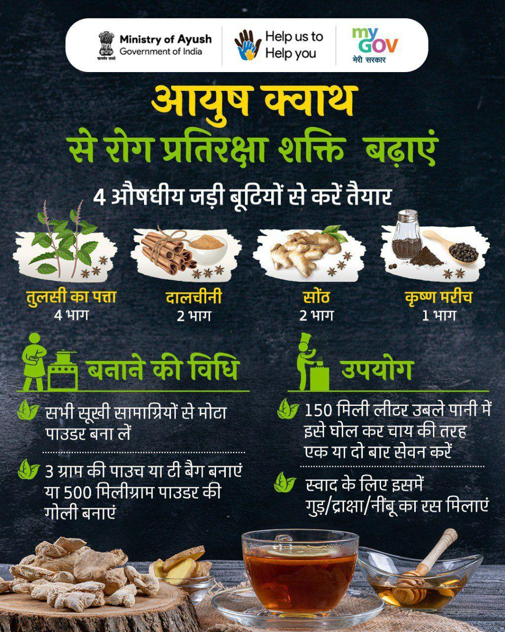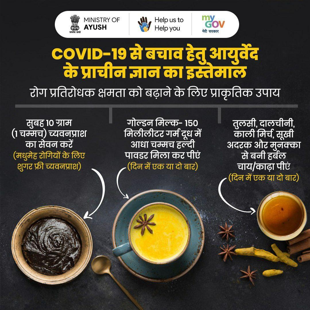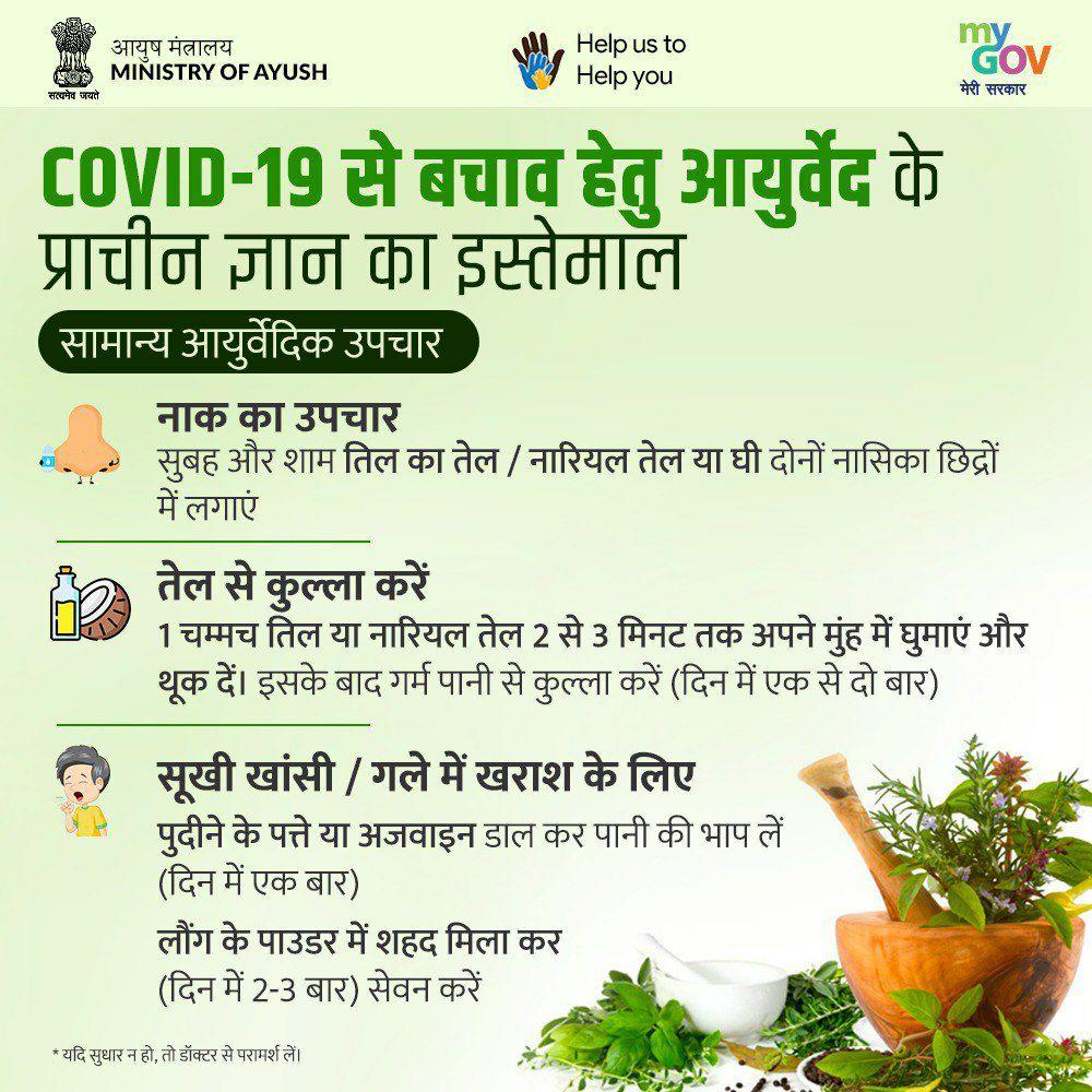 पिछले तीन महीने से आयुष मंत्रालय ने विभिन्न ई-पोस्टर्स के ज़रिए आयुर्वेदिक इलाज का प्रचार कर रहा है। इनमें नाक में तेल डालना, तेल का कुल्ला करना, तुलसी, लौंग, दालचीनी का काढ़ा पीना जैसी सलाह दी गई हैं।