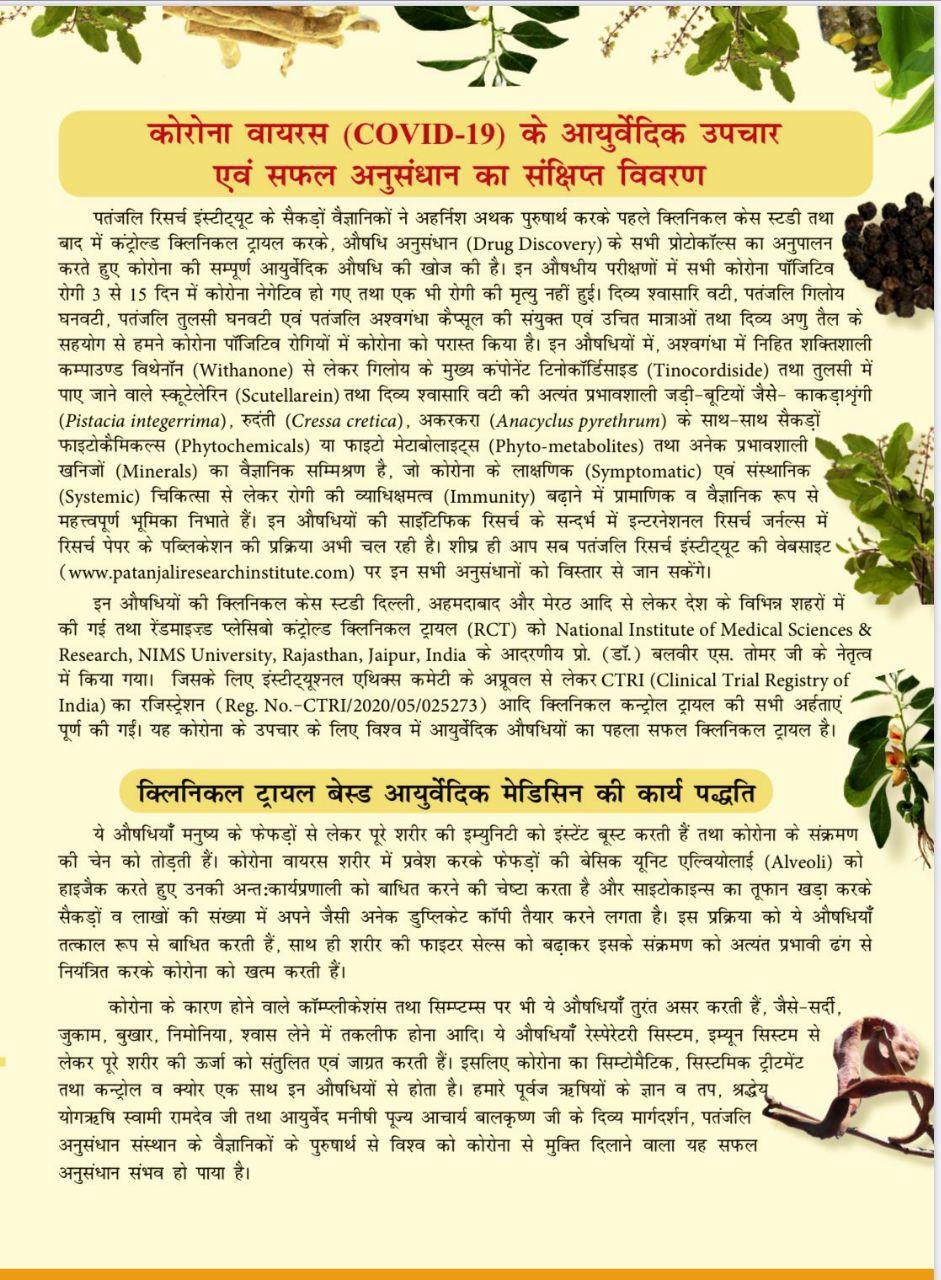 कोरोना इलाज किट की लाँचिंग करते हुए बाबा रामदेव ने कहा कि पूरा देश और दुनिया जिस क्षण की प्रतीक्षा कर रहा था आज वो क्षण आ गया है। कोरोना की पहली आयुर्वेदिक दवा तैयार हो गई है। दवाओं के ट्रायल के दौरान तीन दिन के अंदर 69 पर्सेंट रोगी नेगेटिव हो गए। इसके अलावा ट्रायल के दौरान सात दिन में 100 फीसदी मरीज नेगेटिव हो गये।