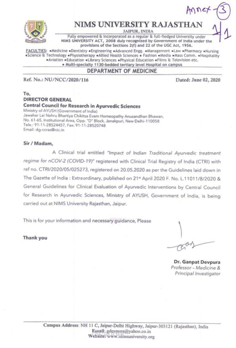 पतंजलि ने आयुष मंत्रालय को जो जवाब दिया है, उसके मुताबिक़ राजस्थान में हुए ट्रायल के बारे में उन्होंने मंत्रालय को जानकारी दी थी। 2 जून को NIMS राजस्थान ने इस संदर्भ में मेल किया। इसके बाद फिर यह सवाल उठता है कि मंत्रालय ने दवा के ट्रायल की जानकारी ना होने का दावा क्यों किया? NIMS राजस्थान द्वारा भेजे गये उस लैटर की इमेज आप ऊपर देख सकते हैं।
