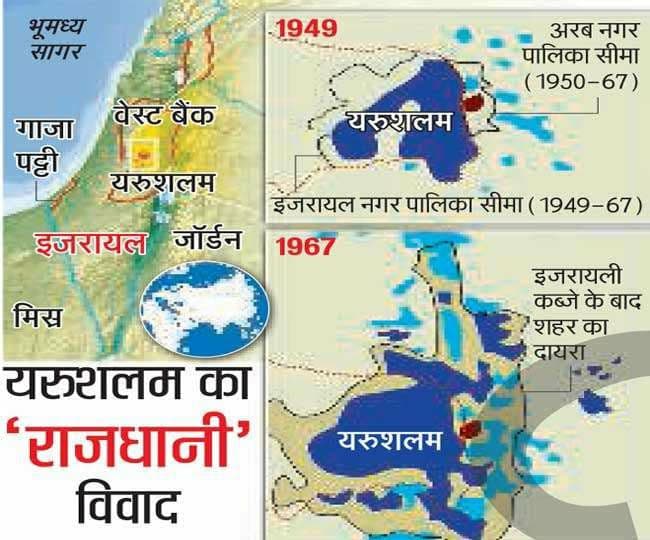 1967 की अरब-इस्राईल जंग के बाद, इस्राईल ने एक बड़े भूभाग पर क़ब्ज़ा कर लिया और फलस्तीनी आबादी को गाज़ा व वेस्ट बैंक तक सीमित कर दिया। इस युद्ध के बाद इस्राईल ने पूर्वी यरुशलम को नियंत्रण में ले लिया था और वो पूरे शहर को अपनी राजधानी मानता है। दिसम्बर 2017 में अमेरिका ने भी यरुशलम को इस्राईली राजधानी के रूप में स्वीकार कर लिया।