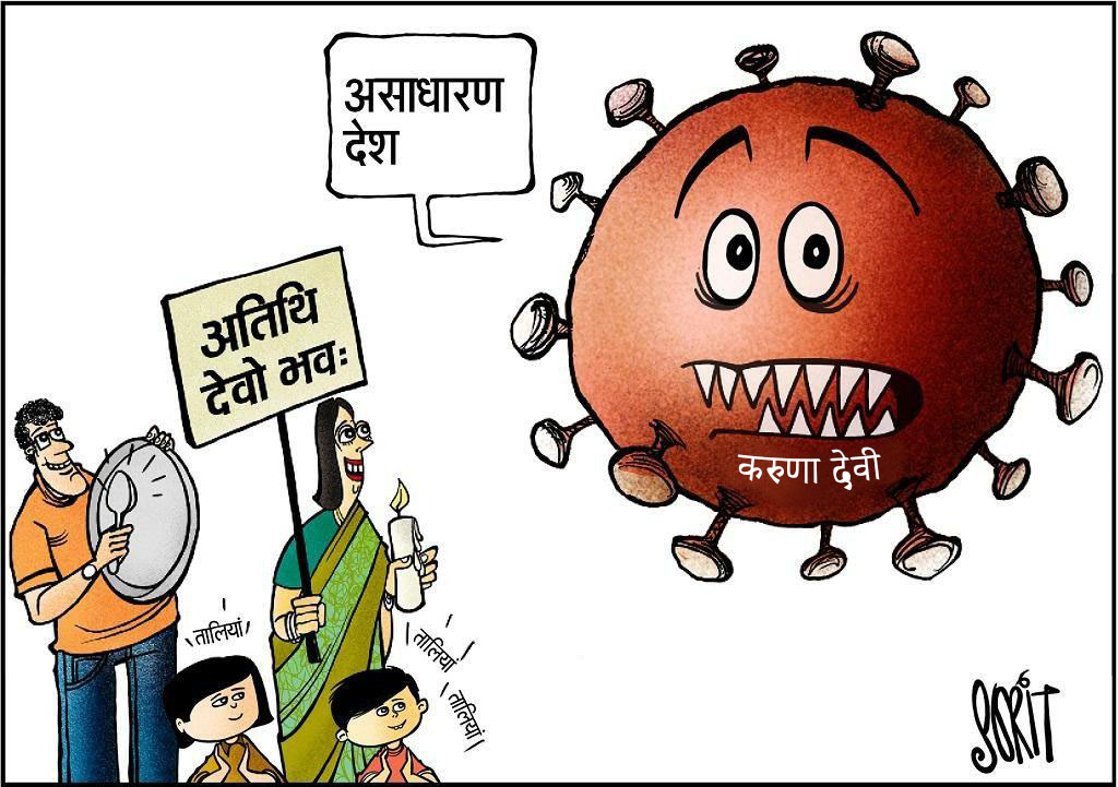 फैक्ट्रियां, दुकानें सब बंद कर दी गईं। कामगारों को नौकरियों से निजात दे दी गईं। सबको गुलामों और घोड़ों की तरह मुँह पर पट्टा बाँधना अनिवार्य किया गया। जो लोग 2014 के पहले के तमाम लौकिक सुखों से दु:खी थे उनमें प्रसन्नता का सागर हिलोरे मारने लगा। जनता ने ढोल-थाली बजाकर करुणा देवी का भव्य स्वागत किया।