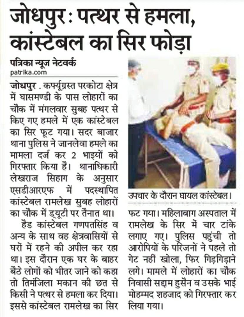 जोधपुर (राजस्थान), 21 अप्रैल 2020 शहर के सदर बाज़ार थाना क्षेत्र के घासमंडी इलाक़े में गश्त कर रहे पुलिस कांस्टेबल पर कथित रूप से किसी ने पत्थर फैंका, जिससे उसके सर पर चोट लगी। ऐसा 22 अप्रैल 2020, जोधपुर शहर से प्रकाशित होने वाले अखबारों में ख़बर के रूप में छपा। हमने यहां दो बड़े अखबारों की न्यूज़ के स्क्रीनशॉट इस पोस्ट के साथ दिये हैं।