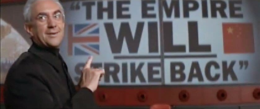 उसके बाद टुमॉरो का सम्पादक, ब्रिटेन और चीन के झण्डे के बीच में अगली स्टोरी का टाइटल लगाता है, The Empire will Strike Back (एम्पायर वापस जवाब देगा)।