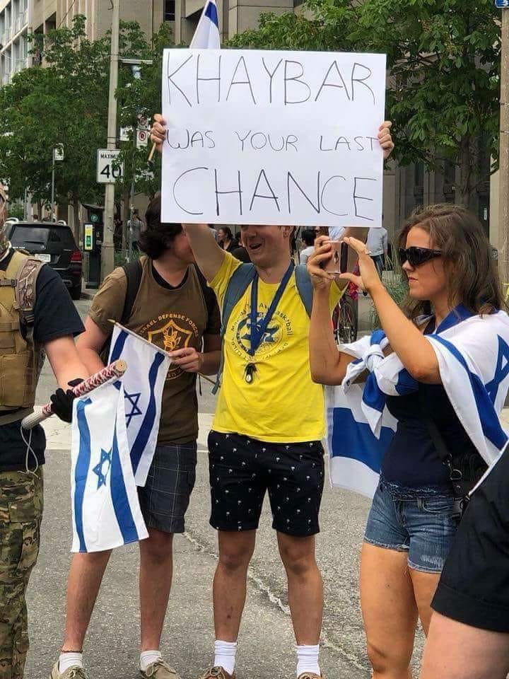 जून 2018 से एक फ़ोटो सोशल मीडिया पर शेयर हो रही है। इस फ़ोटो में कुछ लोग हाथों में एक तख़्ती उठाए हुए हैं जिस पर लिखा था, Khaibar was your Last Chance (ख़ैबर तुम्हारा आख़री मौक़ा था)। क्या है यह मामला, आइये जानने की कोशिश करते हैं।