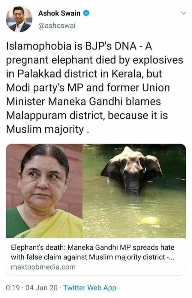 केरला में कोरोना को लेकर बेहतरीन काम हो रहा है वहां की सरकार बेहतरीन काम कर रही है। महाराष्ट्र सरकार की मदद कर रही है। अपने डॉक्टरों की टीम भेज रही है कुछ दिनो पहले गुजरात सरकार ने भी केरल से मदद मांगी थी। लेकिन किसी न किसी मुद्दे पर केरल सरकार और वहा की जनता को बदनाम करना है। गर्भवती हथिनी की मौत की घटना को लगातार मलप्पुरम का बताया जा रहा है। सब लोग मलप्पुरम का नाम लिखने लगे, जबकि घटना पलक्कड़ की है।