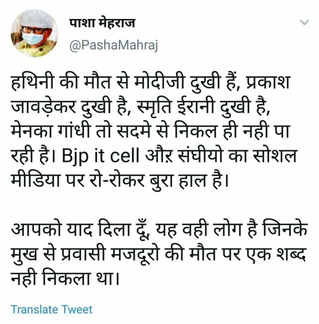 हथिनी की मौत से मोदीजी दुखी हैं, प्रकाश जावड़ेकर दुखी है, स्मृति ईरानी दुखी है, मेनका गांधी तो सदमे से निकल ही नही पा रही है। मोदी समर्थकों का सोशल मीडिया पर रो-रोकर बुरा हाल है।