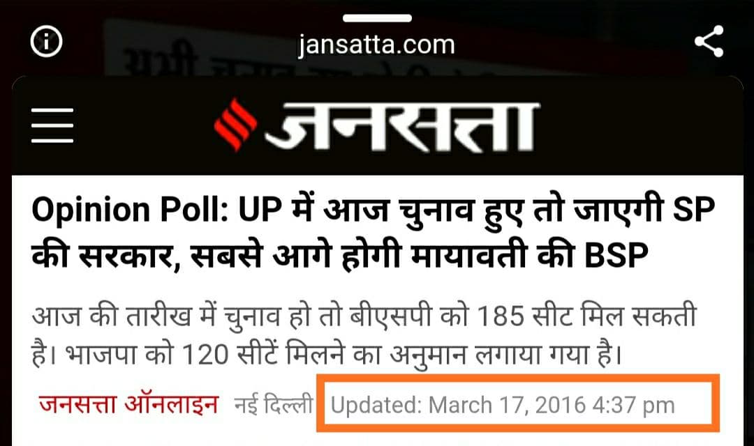 उत्तर प्रदेश, साल 2016, क़रीब-क़रीब सभी राजनीतिक विशेषज्ञ यह मान रहे थे कि अखिलेश यादव की सरकार 2017 में वापस नहीं आएगी। राजनीतिक रायशुमारियाँ अगली सरकार मायावती की बता रही थीं। बीजेपी उस वक़्त भी तीसरे नम्बर पर बनी हुई थी। इस बात की ताईद उस वक़्त की मीडिया रिपोर्ट्स भी कर रही थी। 17 मार्च 2016 की एक ख़बर और एक ओपिनियन पोल का स्क्रीनशॉट देखिये।