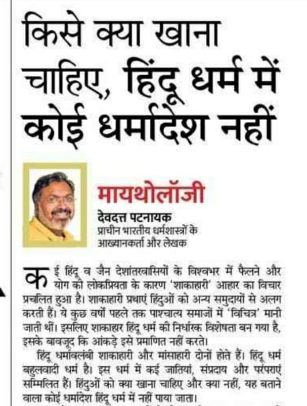 नोट : हमें लगता है कि प्राचीन भारतीय धर्मशास्त्रों के आख्यानकर्ता और लेखक देवदत्त पटनायक के इस लेख को पढ़ने के बाद मांसाहार के सम्बंध में बहुत सारी ग़लत धारणाओं का निराकरण हो जाता है। हिंदू धर्म में माँस खाना वर्जित नहीं है, यह लेखक ने हिंदू धर्म से जुड़े तथ्यों के साथ समझाया है।