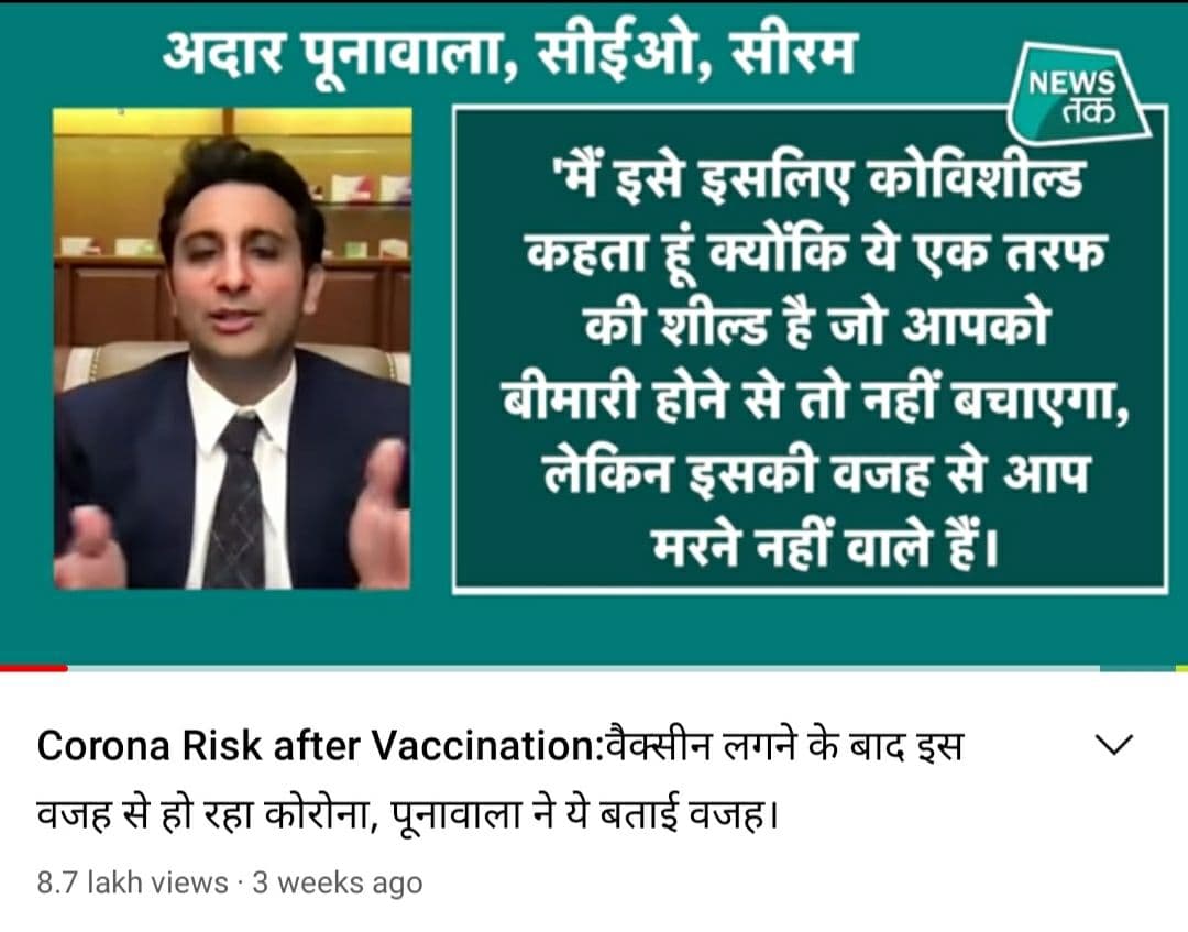इस ब्लॉग के साथ दिये गये वीडियो को देखिये, इस वीडियो के स्क्रीनशॉट्स को देखिये। कोविशील्ड वैक्सीन बनाने वाले सीरम इंस्टीट्यूट ऑफ़ इंडिया के अदार पूनावाला क्या कह रहे हैं, सुनिये।