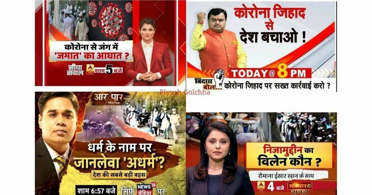 अप्रैल 2020 में कोरोना वायरस के फैलाव के चलते, कुछ मीडिया चैनल्स ने एक मुस्लिम संगठन तब्लीग़ी जमाअत को दानव के रूप में पेश किया। देश में ज़बरदस्त माहौल ख़राब हुआ। उन मीडिया चैनल्स के ख़िलाफ़ सुप्रीम कोर्ट में एक केस भी चल रहा है, जिसमें केंद्र सरकार और प्रेस काउंसिल ऑफ इंडिया से 15 जून तक जवाब देने को कहा गया है कि उसने क्या कार्रवाई की?