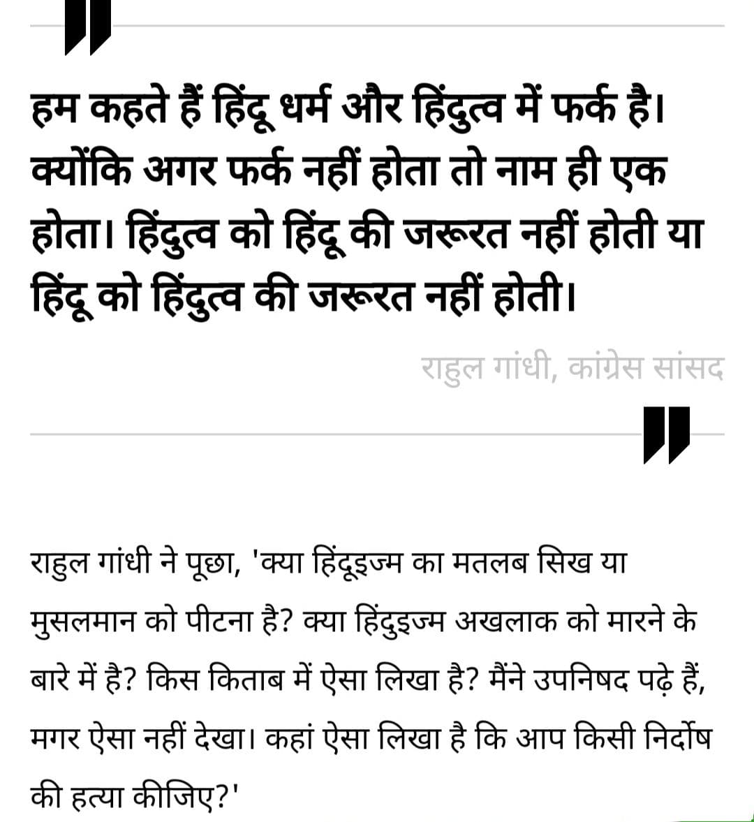 राहुल गांधी ने पूछा, 'क्या हिंदूइज्म का मतलब सिख या मुसलमान को पीटना है? क्या हिंदुइज्म अखलाक को मारने के बारे में है? किस किताब में ऐसा लिखा है? मैंने उपनिषद पढ़े हैं, मगर ऐसा नहीं देखा। कहां ऐसा लिखा है कि आप किसी निर्दोष की हत्या कीजिए?'