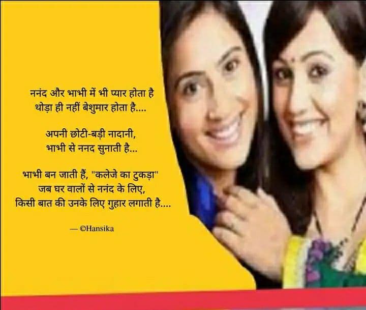 कोई मानें या न मानें लेकिन, ननद-भाभी के रिश्ते दो बहनों और दो दोस्तों के रिश्तों से भी बढ़कर होते हैं क्योंकि हम-उम्र की वजह से ननद किसी भी भाभी और भैया के बीच सबसे क़रीबी कड़ी हो सकती है। अगर ननद समझदारी से काम ले तो वह भाभी की बेस्ट फ्रेंड बन सकती है।