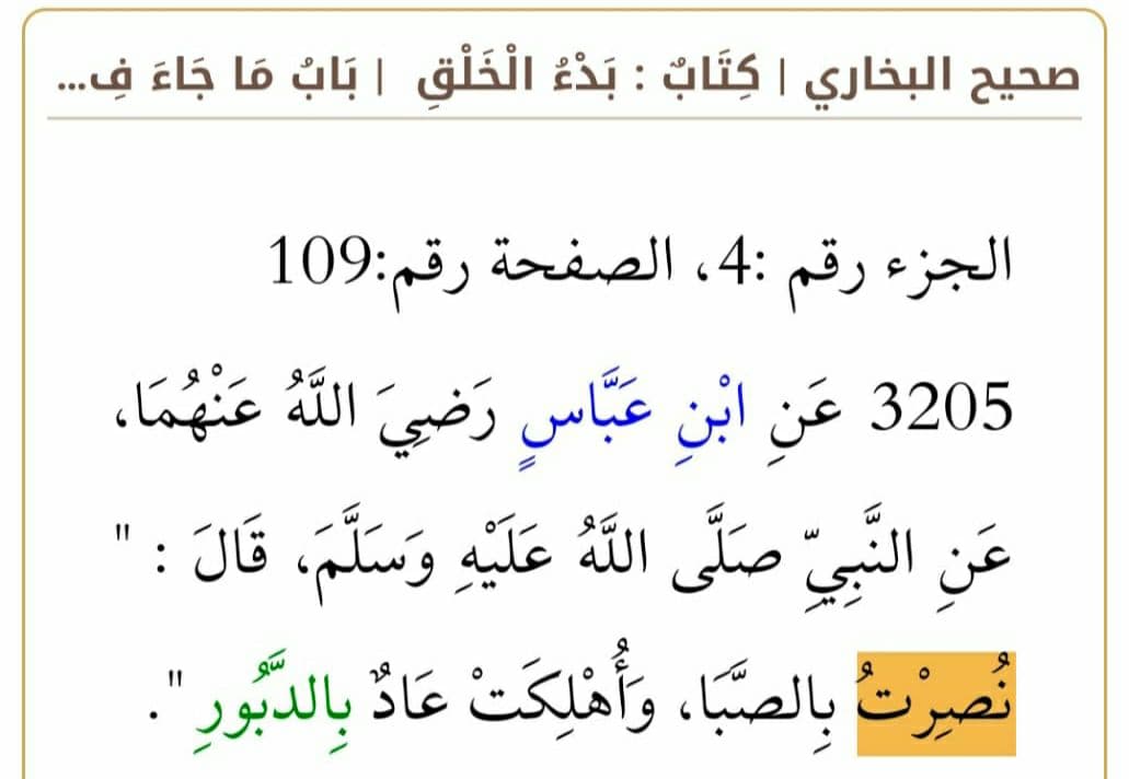 एक हदीस में अल्लाह के रसूल (सल्लल्लाहु अलैहि व सल्लम) ने इर्शाद फ़रमाया, मुझसे पहले की उम्मतें पश्चिमी हवाओं से हलाक (समाप्त) कर दी गई लेकिन मेरी मदद पूरब की हवाओं से की गई। (सहीह बुख़ारी : 3205)
