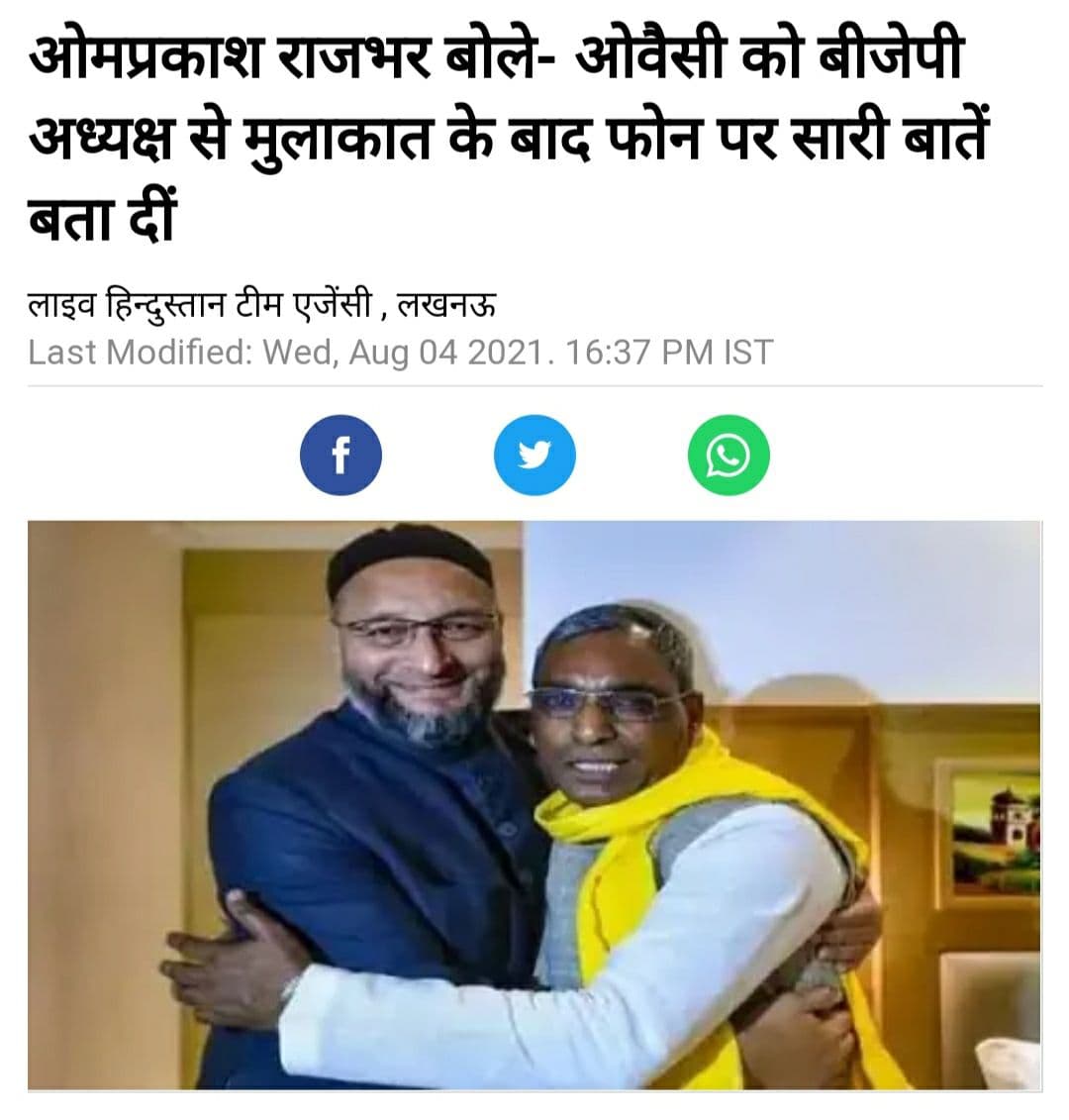 ओमप्रकाश राजभर उत्तरप्रदेश बीजेपी अध्यक्ष से मुलाक़ात करते हैं, बीजेपी से गठबंधन की शर्तों के बारे में डिस्कस करते हैं और वह इस मीटिंग की रिपोर्टिंग ओवैसी को करते हैं। यह क्या खेल हो रहा है?