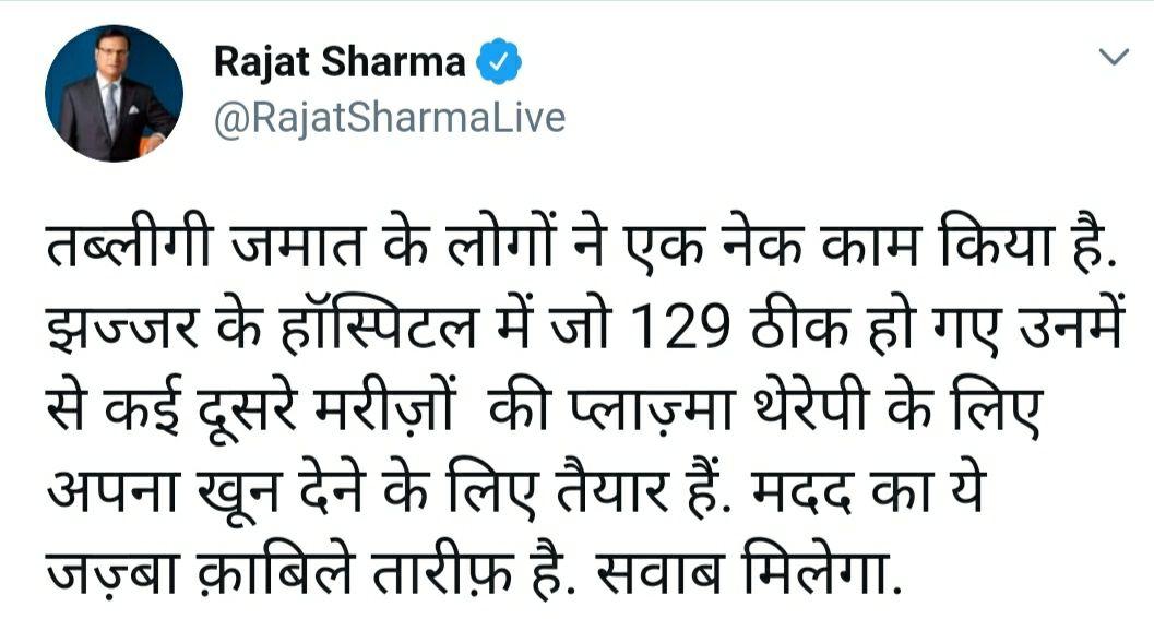 तब्लीग़ी जमाअत के ख़िलाफ़ आक्रामक रिपोर्टिंग करने वाले चैनलों में से एक इंडिया टीवी के रजत शर्मा का यह ट्वीट देखिये,