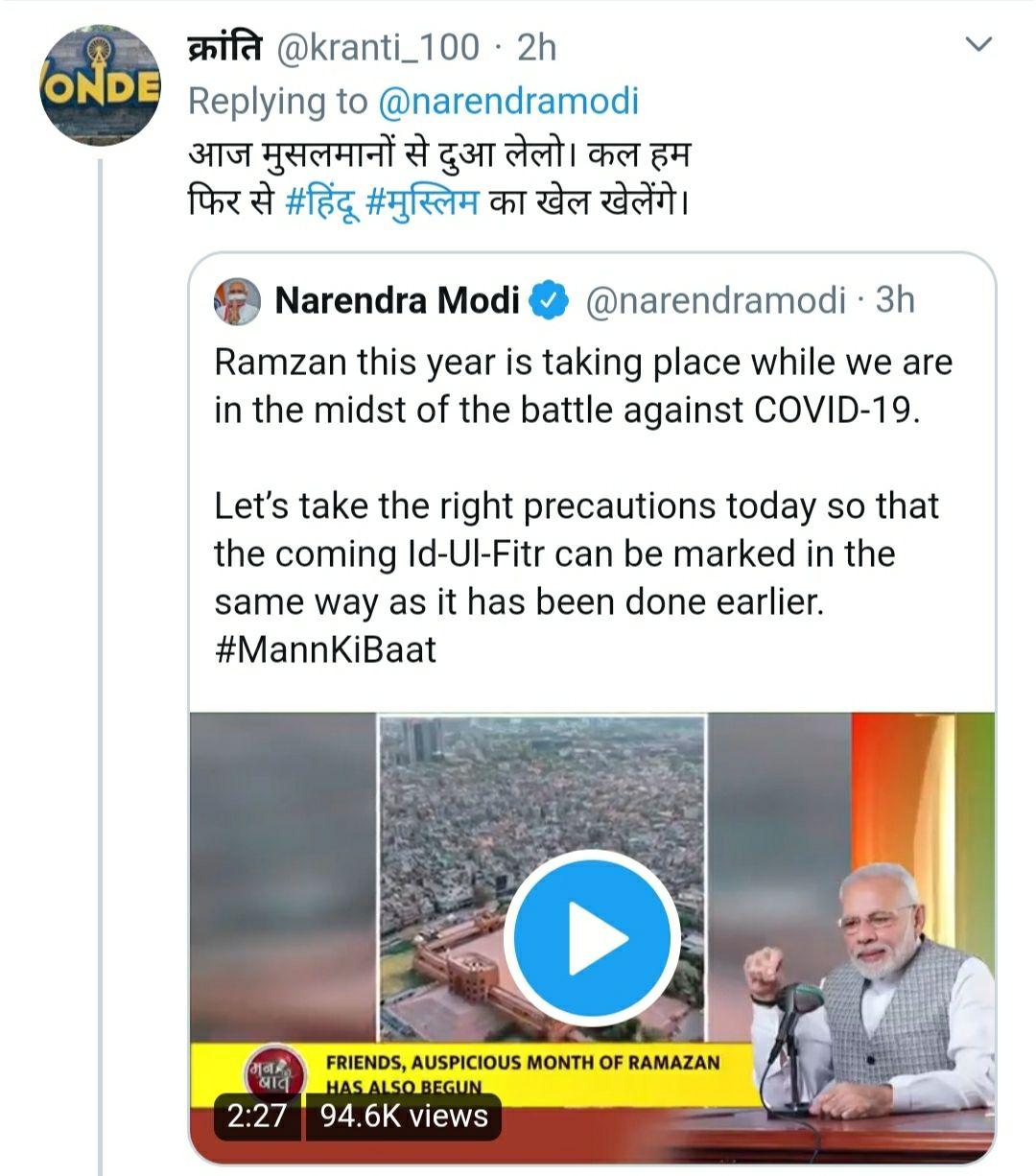 मन की बात कार्यक्रम में प्रधानमंत्री नरेंद्र मोदी ने रमज़ान में पहले से ज़्यादा इबादत और दुआ करने की अपील की ताकि ईद से पहले सब ठीक हो जाए। प्रधानमंत्री मोदी का यह बयान उनके फैन समझे जाने वाले कुछ लोगों को बेहद नागवार लगा है। आज के ब्लॉग में हम प्रधानमंत्री नरेंद्र मोदी और PMO के ट्विटर हैंडल से प्राप्त वीडियो, फोटोज़ के साथ उस पर कुछ उनके फैंस की नकारात्मक प्रतिक्रियाओं से हम आपको अवगत कराएंगे, जिसमें अर्णब गोस्वामी की प्रतिक्रिया भी शामिल है। इस ब्लॉग में आरएसएस प्रमुख मोहन भागवत के बयानों पर भी चर्चा की गई है। अधिक जानकारी के लिये इस ब्लॉग को अंत तक पढ़ियेगा।