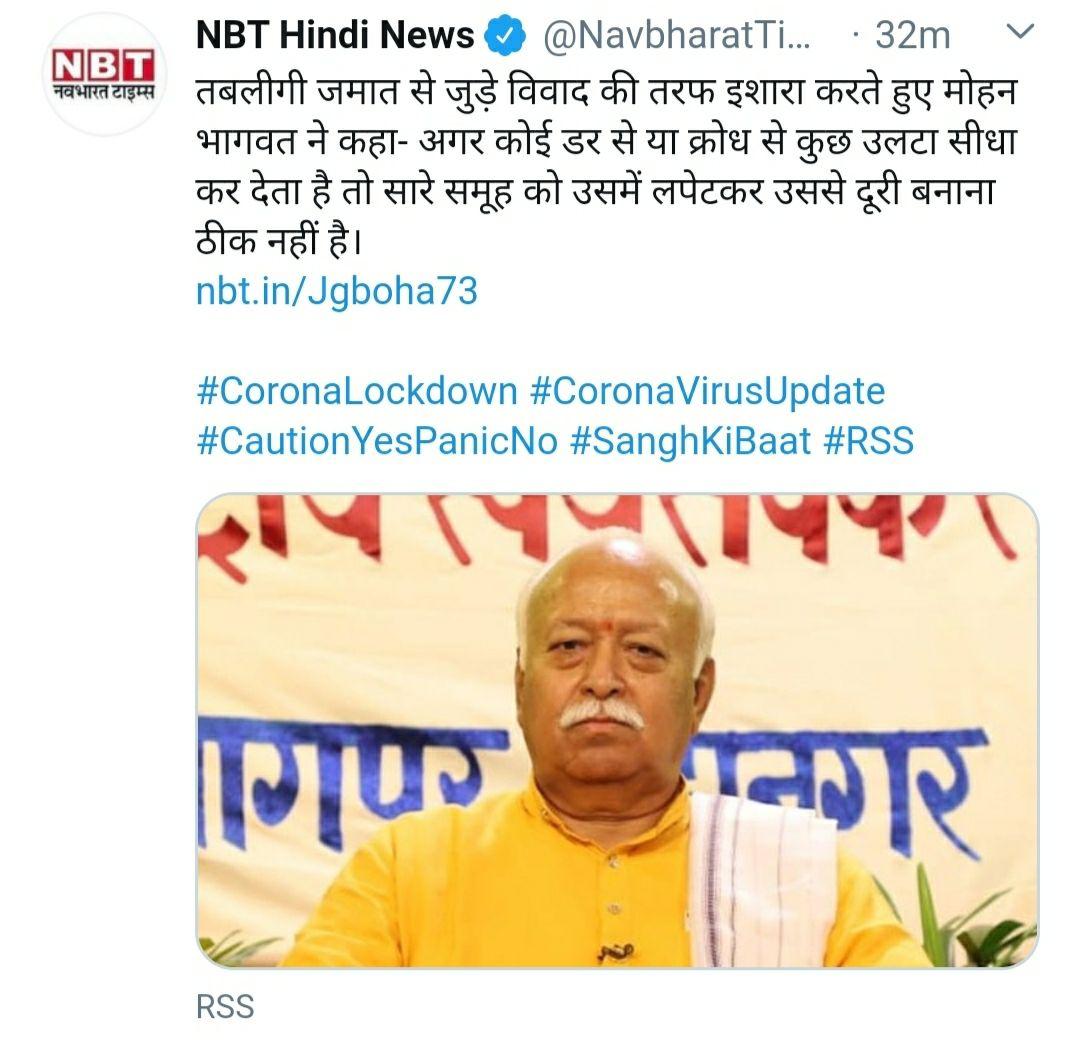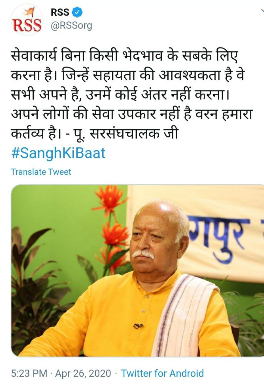 अपने लोग शब्दों का इस्तेमाल संघ प्रमुख ने किनके लिये किया, इसका अंदाज़ा उनके एक अन्य ट्वीट से लगाया जा सकता है। संघ प्रमुख सिर्फ़ यहीं तक नहीं रुके बल्कि एक क़दम और आगे बढ़कर तब्लीग़ी जमाअत का बचाव करते हुए भी नज़र आए।