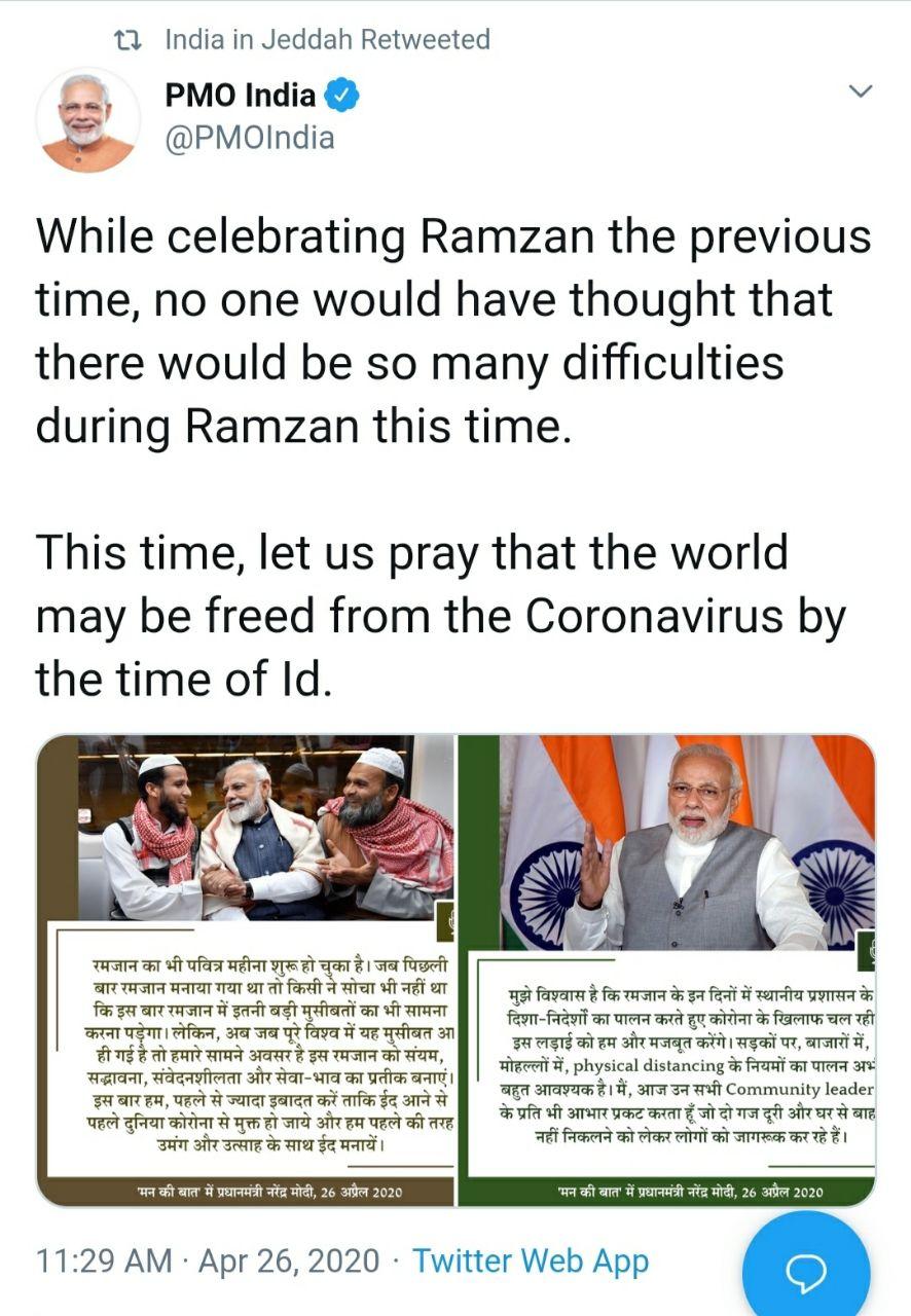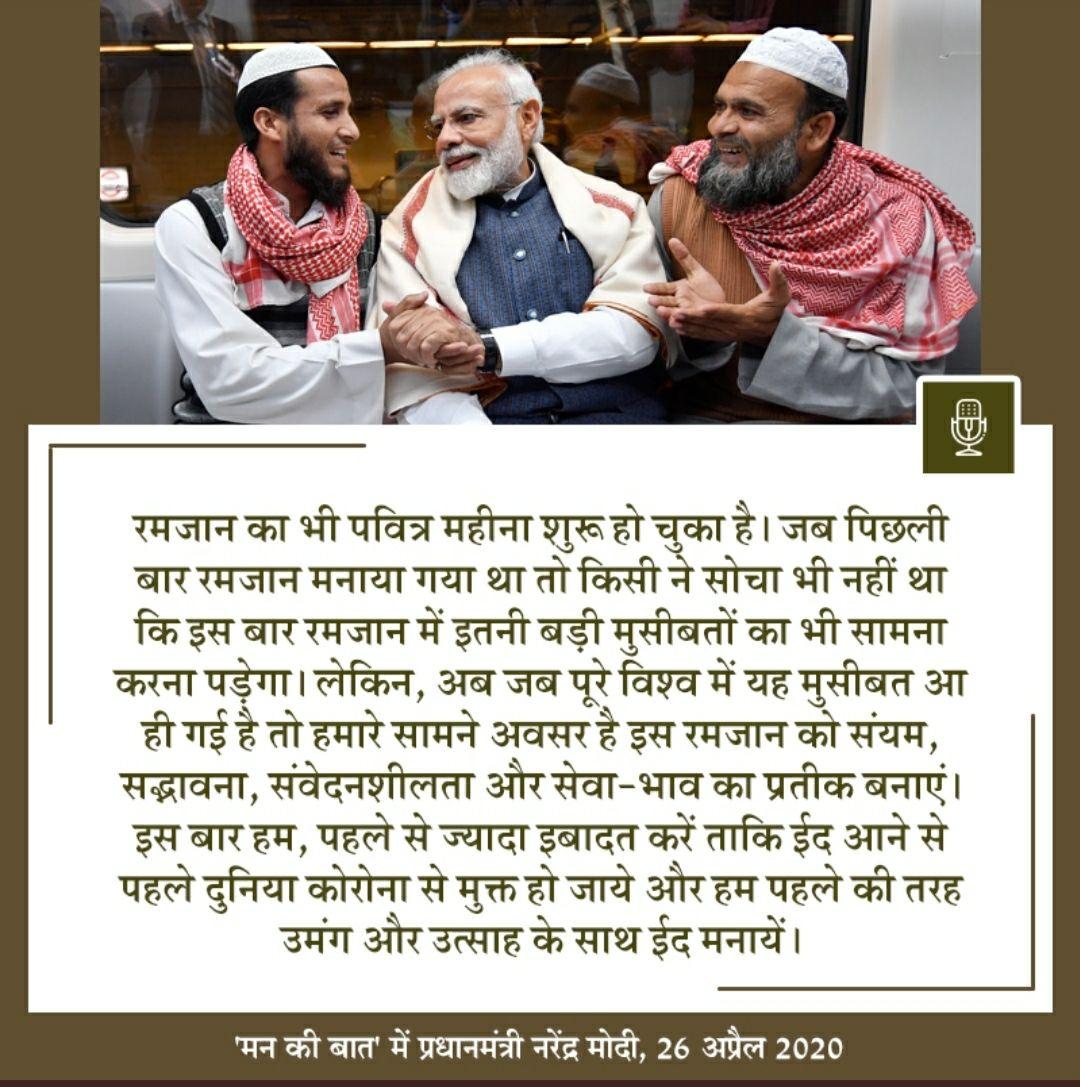 आज 26 अप्रैल 2020 को ऑल इंडिया रेडियो पर मन की बात कार्यक्रम के दौरान प्रधानमंत्री नरेंद्र मोदी ने कहा, रमज़ान का भी पवित्र महीना शुरू हो गया है। जब पिछली बार रमज़ान मनाया गया था तब किसी ने सोचा भी नहीं होगा कि इस बार रमज़ान में इतनी बड़ी मुसीबतों का भी सामना करना पड़ेगा। लेकिन, जब पूरे विश्व में यह मुसीबत आ ही गई है तो हमारे सामने अवसर है कि इस रमज़ान को संयम, सद्भावना, संवेदनशीलता और सेवा-भाव का प्रतीक बनाएं। इस बार हम, पहले से ज़्यादा इबादत करें ताकि ईद आने से पहले दुनिया कोरोना से मुक्त हो जाए और हम पहले की तरह उत्साह और उमंग के साथ ईद मनाएं।