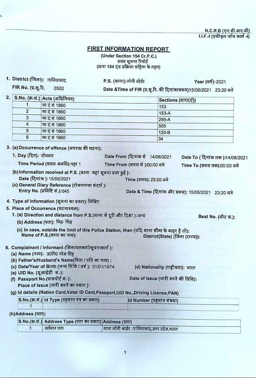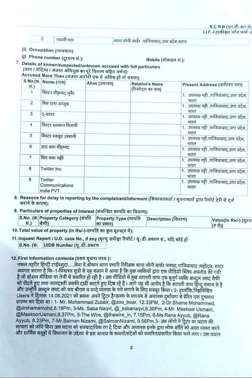 15 जून 2021 की रात 11.30 बजे; गाजियाबाद पुलिस ने ट्विटर इंडिया और कांग्रेस नेता समेत 9 लोगों के खिलाफ FIR दर्ज की। FIR में आरोप लगाया गया है कि मारपीट के एक मामले को सांप्रदायिक रंग दिया गया। कहा गया है कि पुलिस द्वारा मामला पूरी तरह से स्पष्ट किए जाने के बावजूद ट्विटर ने गलत ट्वीट को हटाने के लिए कोई कदम नहीं उठाया।
