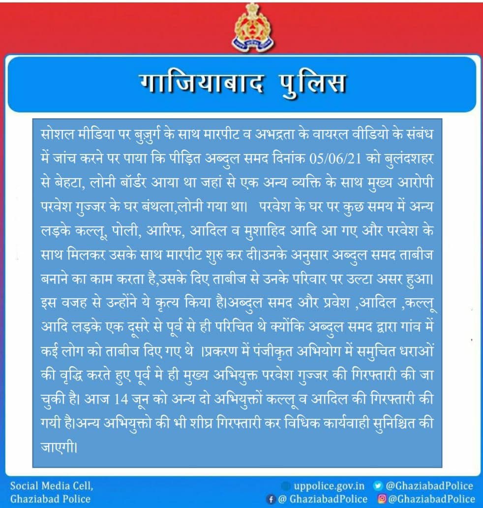 गाज़ियाबाद पुलिस की FIR में कहा गया है कि इन सभी लोगों ने ट्विटर पर सच्चाई को परखे बिना ही एक घटना को सांप्रदायिक रंग दिया। इनकी ओर से समाज में शांति भंग करने और धार्मिक समूहों को भड़काने के मकसद से वीडियो वायरल किया गया। पुलिस के मुताबिक, घटना पीड़ित और शरारती तत्वों के बीच व्यक्तिगत विवाद की वजह से हुई। इसमें हिंदू और मुस्लिम दोनों ही संप्रदाय के लोग शामिल थे, लेकिन आरोपियों ने घटना को इस तरह पेश किया कि दोनों धार्मिक समूहों के बीच तनाव पैदा हो।
