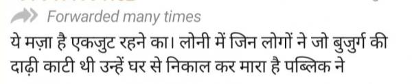 उत्तरप्रदेश के बुलंदशहर निवासी एक बुज़ुर्ग सूफ़ी अब्दुल समद सैफी के साथ मारपीट करने, उनकी दाढ़ी काटने और नारे लगवाने की ख़बर इन दिनों सोशल मीडिया की सुर्ख़ियों में है। इसी सिलसिले में सोशल मीडिया पर एक वीडियो वायरल हो रहा है। वीडियो में लोगों की भीड़ तीन युवकों को घर से निकालकर बेरहमी से पीटते हुए दिख रही है। दावा किया जा रहा है कि वीडियो में भीड़ जिन युवकों को पीट रही है, वे वही हैं, जिन्होंने ग़ाज़ियाबाद में सूफ़ी अब्दुल समद सैफ़ी के साथ मारपीट कर उनकी दाढ़ी काटी थी। इस वीडियो के साथ एक मैसेज लिखा हुआ है जिसका स्क्रीनशॉट आप नीचे देख रहे हैं।