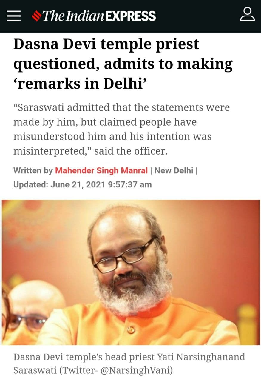 इस न्यूज़ एंड व्यूज़ रिपोर्ट को पढ़ने से पहले इसके साथ दी गई 21 जून 2021 यानी कल के द इंडियन एक्सप्रेस में छपी एक ख़बर के स्क्रीनशॉट को देखिये। दिल्ली पुलिस के मुताबिक महंत यति नरसिंहानंद सरस्वती ने पूछताछ के दौरान माना है कि उन्होंने 'पैग़ंबर मोहम्मद साहब पर टिप्पणी की थी।'