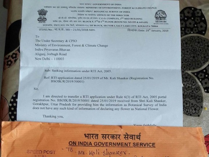 काली शंकर ने कहा कि हम किताबों में पढ़ते चले आ रहे हैं कि कमल हमारा राष्ट्रीय फूल है. लेकिन, जब उन्होंने भारत सरकार के बॉटेनिकल सर्वे ऑफ इंडिया (भारतीय वनस्पति सर्वेक्षण) को आरटीआई के ज़रिये राष्ट्रीय फूल के बारे में जानकारी मांगी तो जवाब में बताया गया कि उनके पास इस तरह की कोई जानकारी नहीं है कि हमारे देश का कोई राष्ट्रीय फूल है।