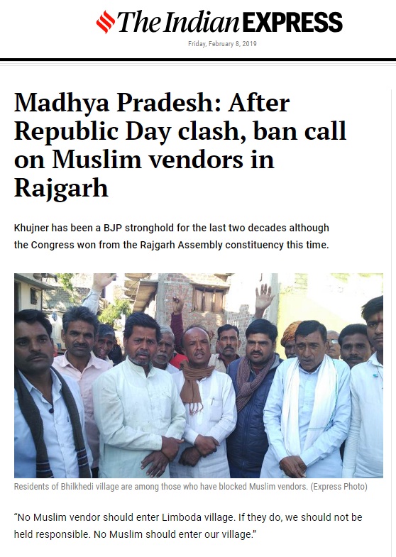 "द इंडियन एक्सप्रेस" अख़बार की एक रिपोर्ट के मुताबिक पूर्वी मध्य प्रदेश के राजगढ़ ज़िले के लिम्बोदा गांव में मुसलमानों के प्रवेश पर रोक की धमकी दी गई है। पुलिस को मिले पत्र में कहा गया है, "लिम्बोदा गांव में कोई मुसलमान फेरी वाला नहीं घुसना चाहिए. अगर वो आए तो हमें ज़िम्मेदार न ठहराया जाए। कोई मुसलमान हमारे गांव में न घुसे।"