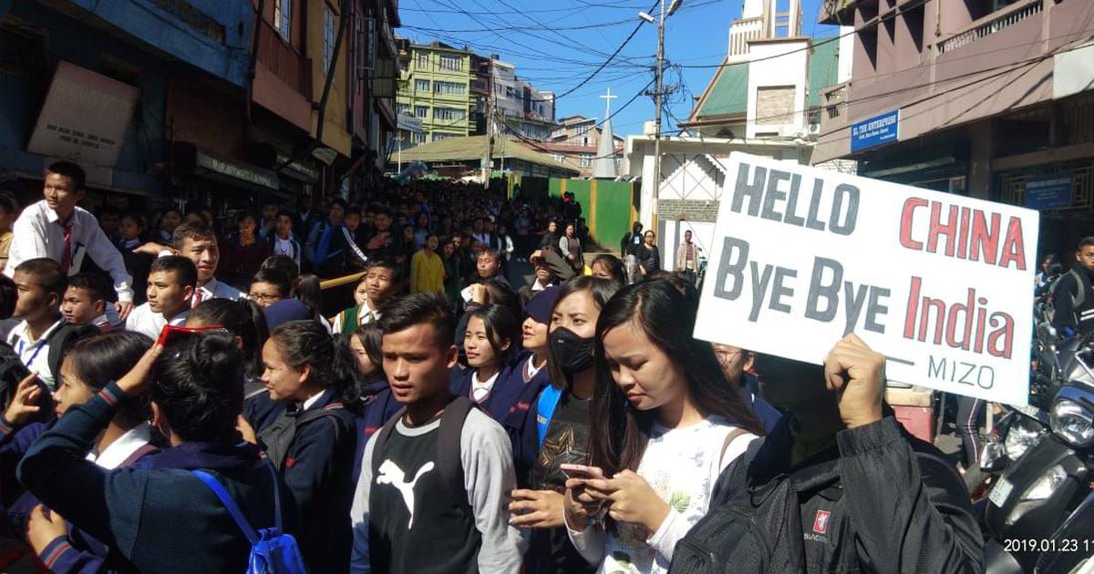 यहाँ दी गई फोटो में आप देख रहे हैं कि मिज़ोरम के इन प्रदर्शनकारियों ने जो तख्ति हाथ में उठा राखी है, उस पर लिखा है, "हेलो चाइना, बाय-बाय इण्डिया"